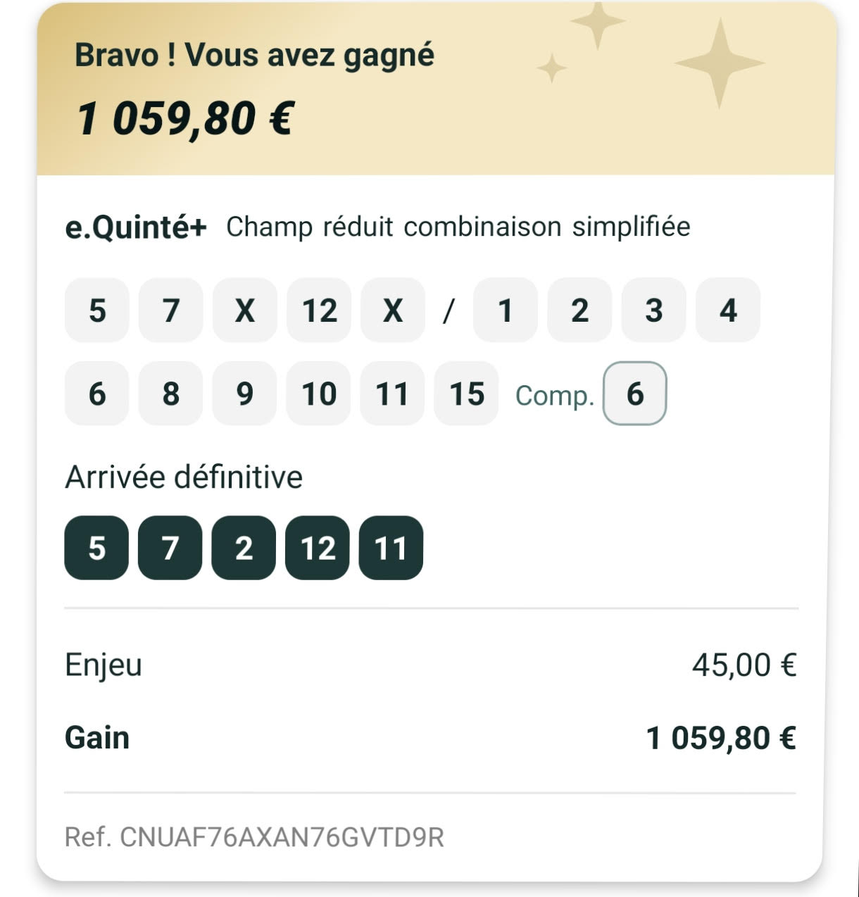 Quinté ordre 50% - Enghien - 26 juillet 2025 - Gain 1601 euros - Gérard Q.