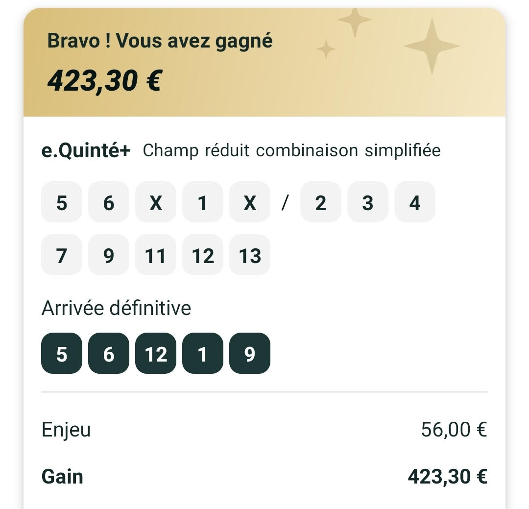 Quinté ordre 50% - Enghien - 29 septembre 2025 - Gain 423 euros - Mickaël T.