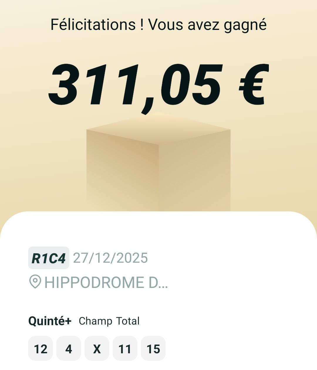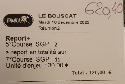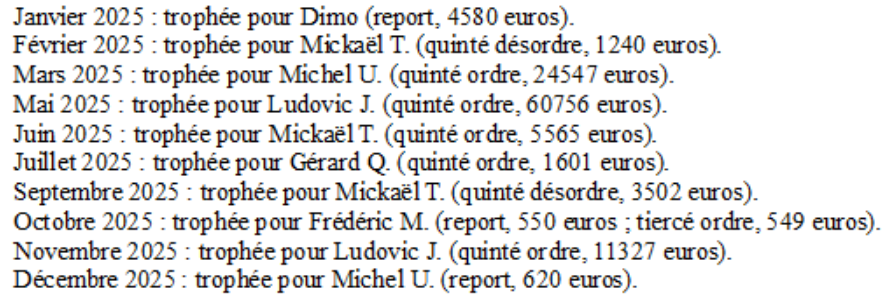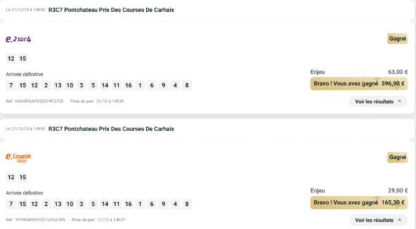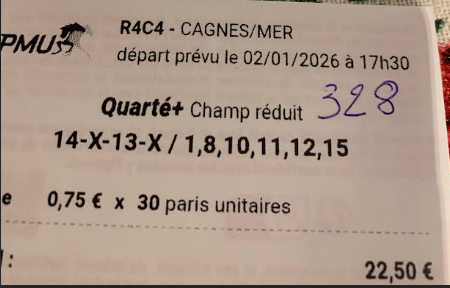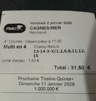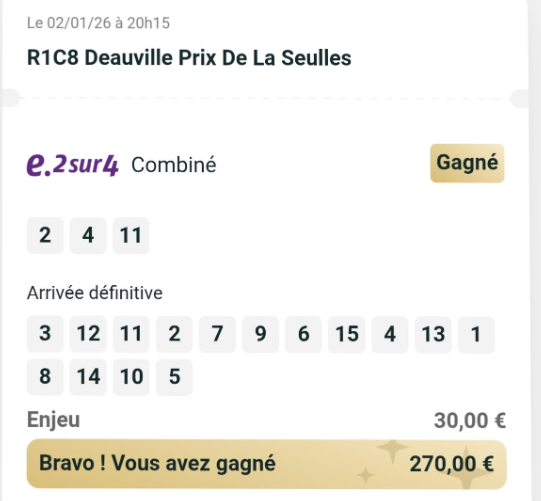 2sur4 par 10 euros - Deauville - 2 janvier 2026 - Gain 270 euros - Billy S. (les trois meilleures cordes sur le parcours).