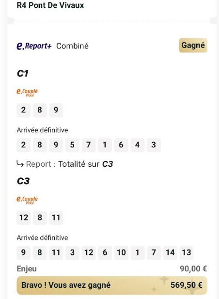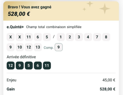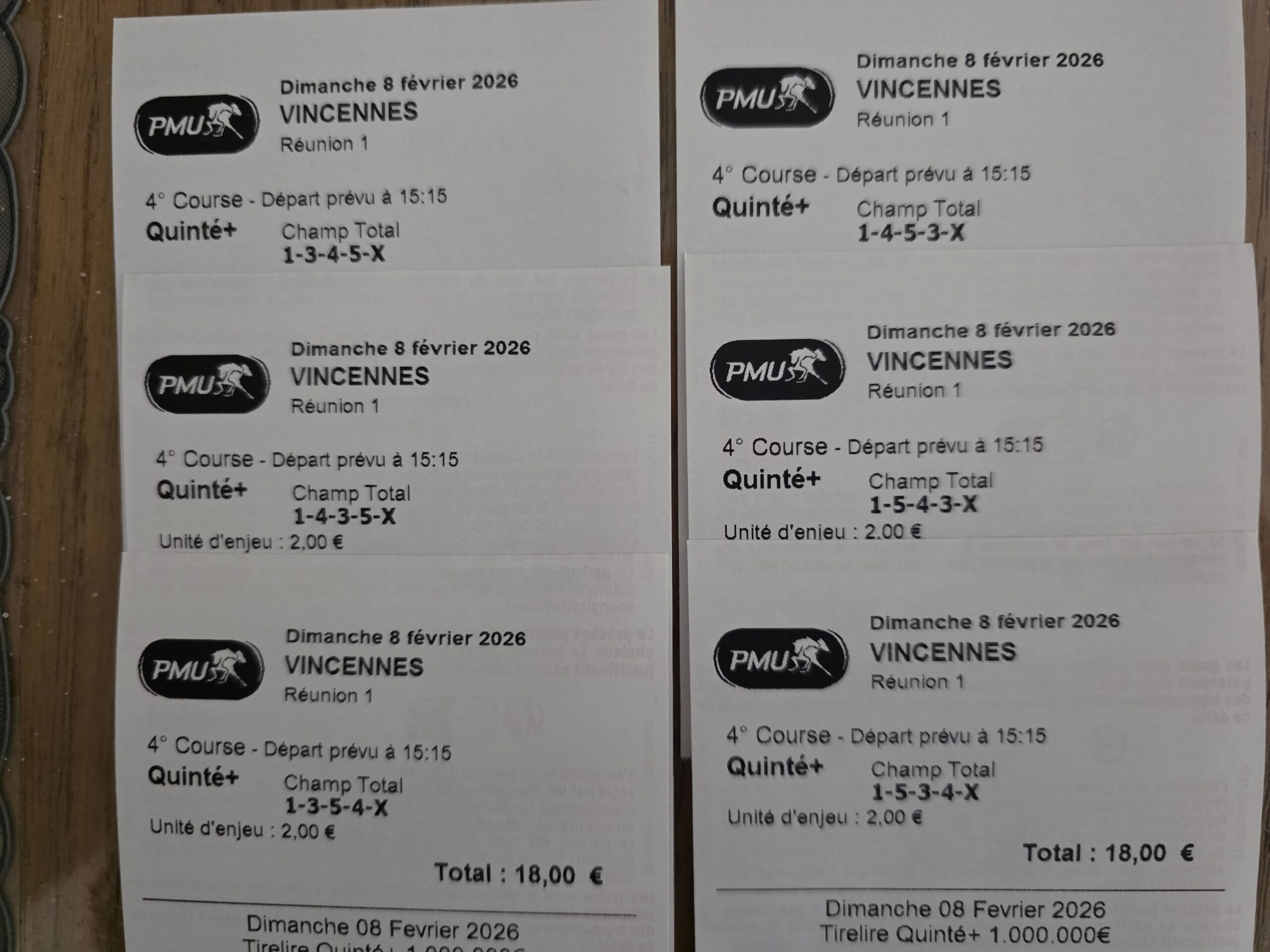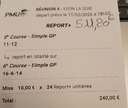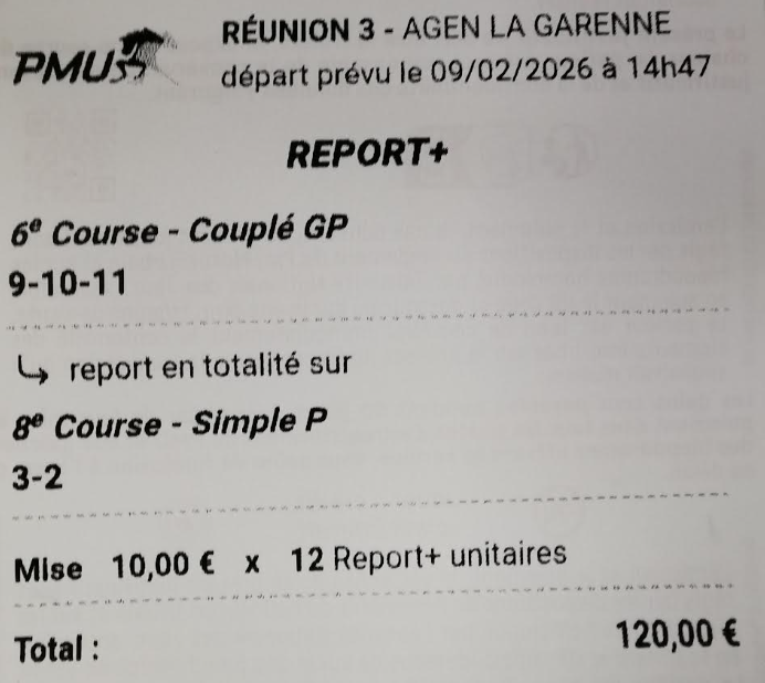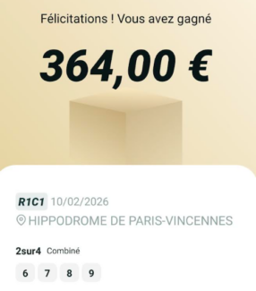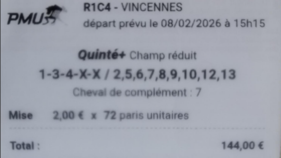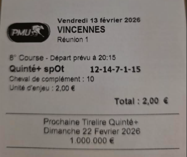 Quinté désordre - Vincennes - 13 février 2026 - Gain 973 euros (tickets Spot pour la cagnotte commune).