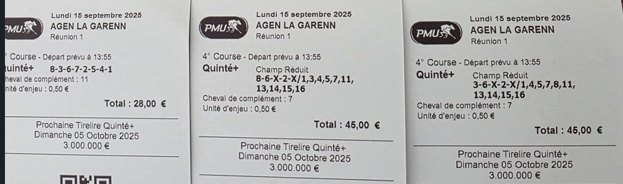 Quinté désordre X 1,25 - Agen - 15 septembre 2025 - Gain 345 euros - Frédéric M.