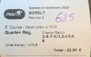 Quarté Plus Régional (QPR) ordre flexi - Marseille-Borély - 8 novembre 2025 - Gain 625 euros - Éric A.