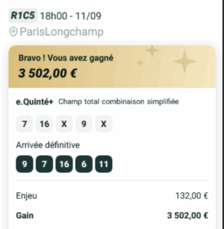 Quinté désordre (en valeur) - ParisLongchamp - 11 septembre 2025 - Gain 3502 euros - Mickaël T. (trophée provisoire).