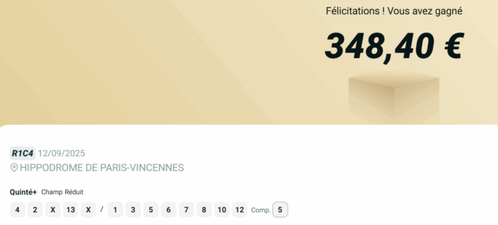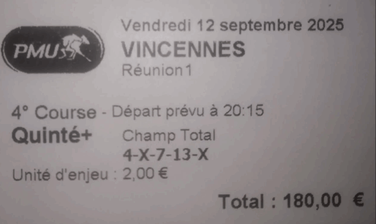 Quinté désordre X 2 (en valeur) - Vincennes - 12 septembre 2025 - Gain 385 euros - Dimo.