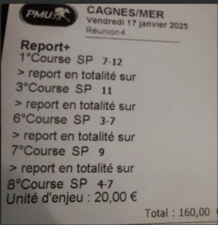 Report - Cagnes-sur-Mer - 17 janvier 2025 - Gain 4580 euros - Dimo (chevaux conseillés + inspiration personnelle). Trophée provisoire.